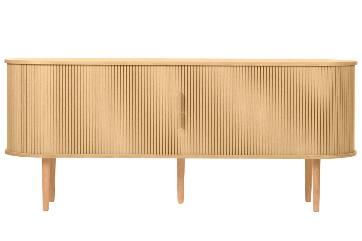 Questo lungo buffet da 180 cm vede le sue curve esaltate dalla materia. Con una struttura e un piano in pannelli di fibra di legno laccato e una base in legno di quercia massello, EPIC esprime con forza il suo amore per l'autenticità. Per completare questo look completamente in legno, questo mobile buffet vintage mostra delle maniglie ultra sottili in metal dorato per far scorrere le sue belle porte.