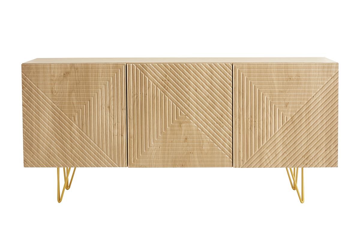 Con la credenza OZEN, gli interni contemporanei hanno trovato una gemma rara! Piccolo gioiello di design, questa credenza moderna si distingue per originalità. Le tre ante sono decorate con un magnifico motivo geometrico in rilievo tono su tono. Insolito ma discreto, esalta l'eleganza del mobile. La finitura in legno chiaro della struttura è messa in risalto dalla base in metallo dorato, un dettaglio chic finemente lavorato che conferisce grande leggerezza all'insieme e apporta una nota di colore.