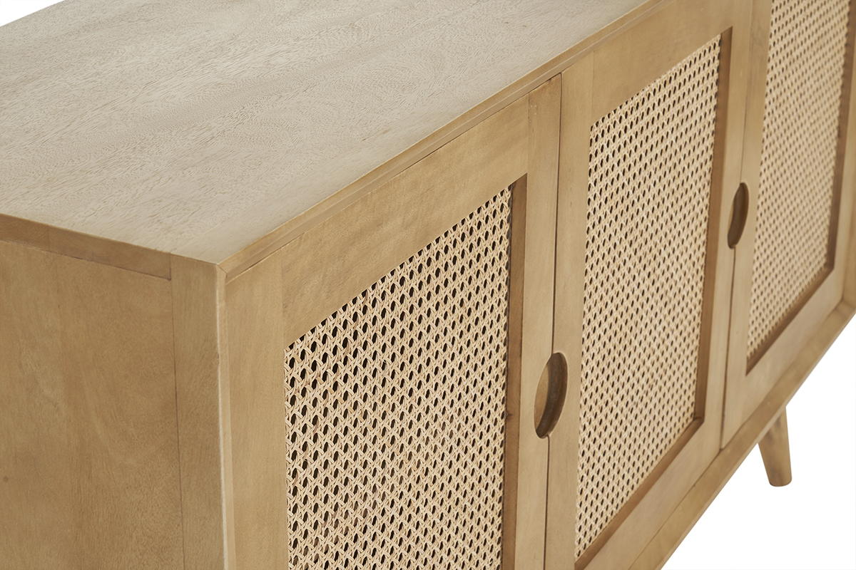 Originale, questa credenza design in legno si distingue per il suo stile unico e la personalità decisa. Il luminoso legno biondo della struttura in legno massello di mango e il motivo a intreccio in rattan sui frontali delle ante formano una combinazione elegante e ricca di carattere.