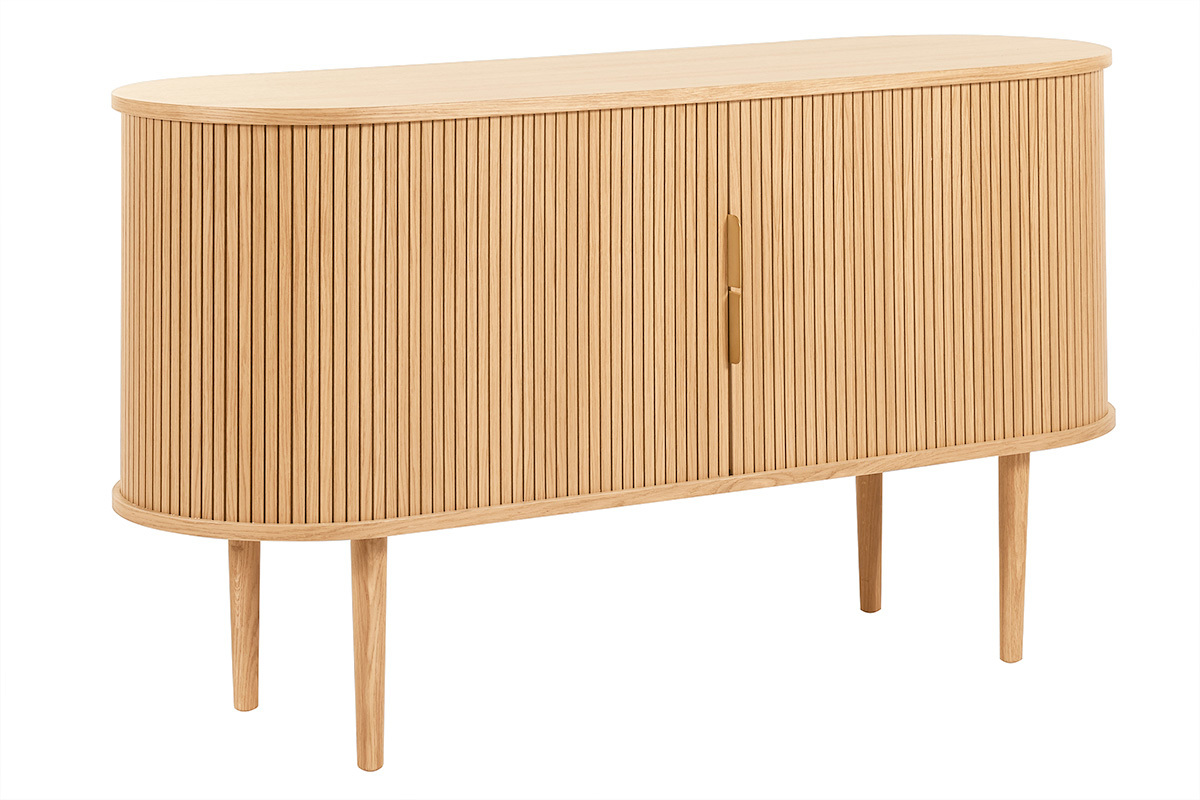 Forma oblunga, base alta e leggermente affusolata, ante scorrevoli in doghe di legno, dettaglio minimal costituito dalle maniglie dorate... In fatto di estetica, questa credenza design non ha nulla da invidiare a quelle più grandi!