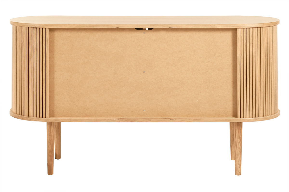 Sostenuta da una solida base in legno massello di rovere, la robusta struttura in pannelli di fibra di legno impiallacciato rovere è dotata di sei scomparti. Quattro nicchie centrali (L48,1 x P36,6 x H21,3 cm) e due nicchie laterali convesse (R22,5 x P36,6 x H48 cm) sono ideali per riporvi stoviglie, biancheria, documenti o libri.