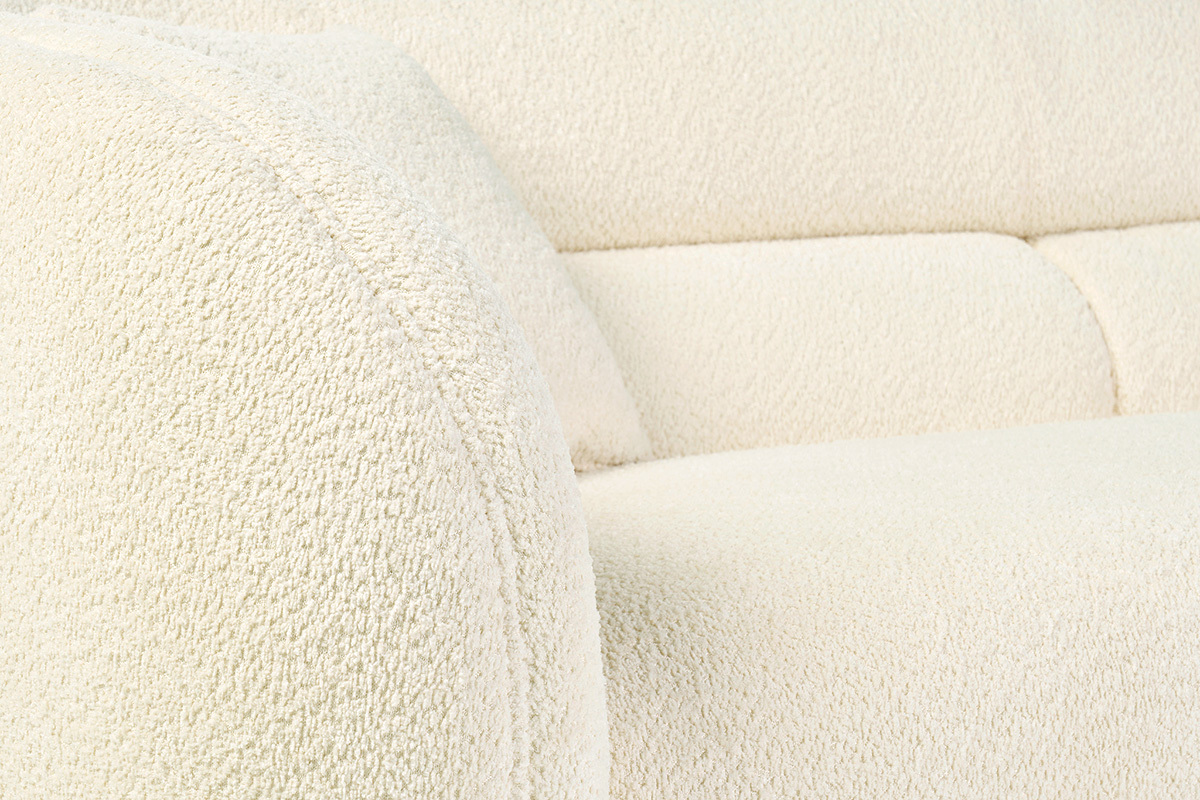Vestito in tessuto bouclé bianco e completato da due cuscini (41 x 41 cm), MOCHI conquista con il suo aspetto morbido e accogliente. Le sue generose curve e le linee arrotondate offrono un comfort avvolgente, ideale per momenti di relax. La sua copertura conferisce una texture ricca e alla moda, accentuando il carattere accogliente del divano. Sempre piacevole al tatto, ricorda l'ambiente caldo e sereno tipico degli interni scandinavi.