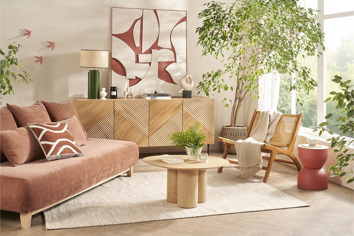Questo divano unico e originale è un vero e proprio condensato di stile che invita ad abbandonarsi al riposo! Seduta bassa in stile anni '70, rivestimento morbido in tessuto effetto velluto testurizzato color terracotta, - un colore avvolgente e molto caldo - questo divano esibisce una perfetta eleganza informale.