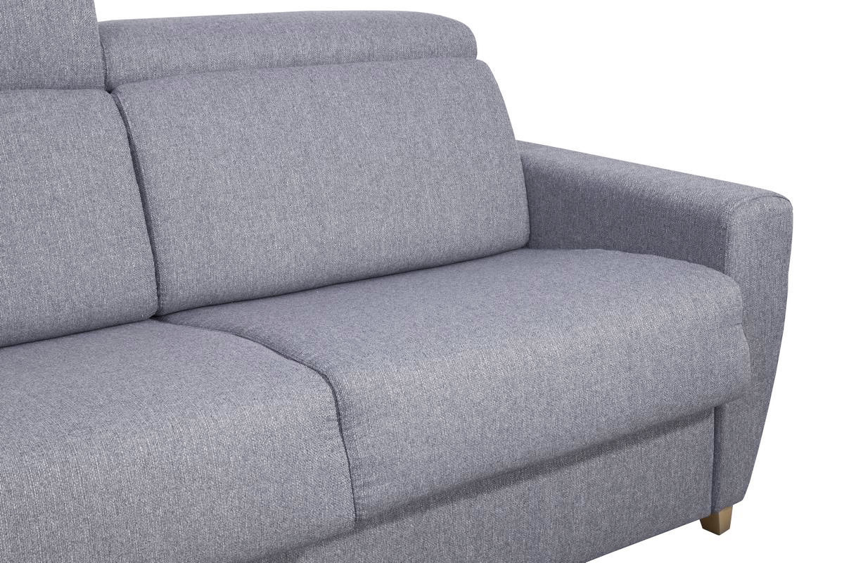 Questo divano 3 posti è rivestito di un elegante tessuto grigio chiaro (100% poliestere) con una solida base in legno massello di faggio. Particolarmente apprezzabili sono i comodi poggiatesta regolabili e il design dalle linee epurate per uno stile senza tempo. I due vani celati nello schienale consentono di riporre la biancheria da letto.