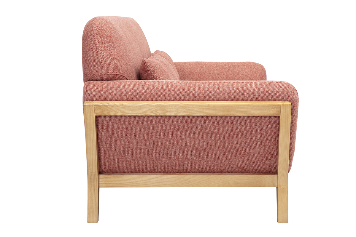 La combinazione di una seduta generosa, rivestita di un tessuto 100% poliestere - piacevole alla vista e al tatto - e una struttura in legno massiccio (frassino massiccio), conferisce tutto il fascino a questo divano in tessuto effetto velluto texture terracotta e legno chiaro.
