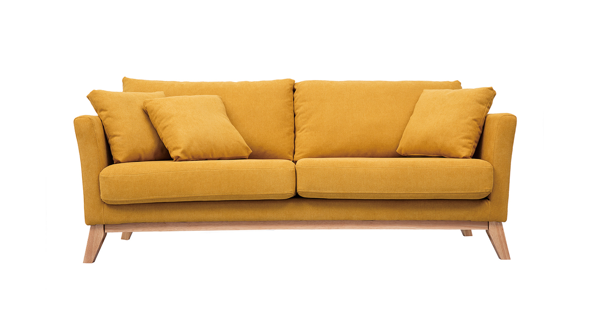 Con le sue linee essenziali e la tinta giallo mostarda, questo divano 3 posti è una seduta elegante e originale. Il modello OSLO è infatti stato pensato per resistere alla prova del tempo senza invecchiare. La struttura in legno di quercia dona all'insieme un tocco caldo e ben si abbina con il rivestimento in poliestere della seduta. Per rendere il vostro salotto un ambiente confortevole, abbinate il divano con mobili di legno e una poltrona dello stesso stile.