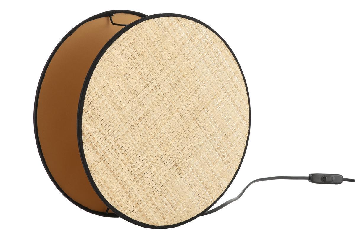 Questa lampada è frutto di un sapiente mix di materiali. Un disco è rivestito di un elegante tessuto di velluto giallo senape, mentre il secondo di un tessuto in fibra di rafia 100% naturale. La fonte luminosa è racchiusa tra i due dischi e fissata da una fine struttura in filo d'acciaio nero. La lampada diffonde una luce soffusa e molto calda, mentre l?effetto luminoso cambia a seconda dell'angolazione.
