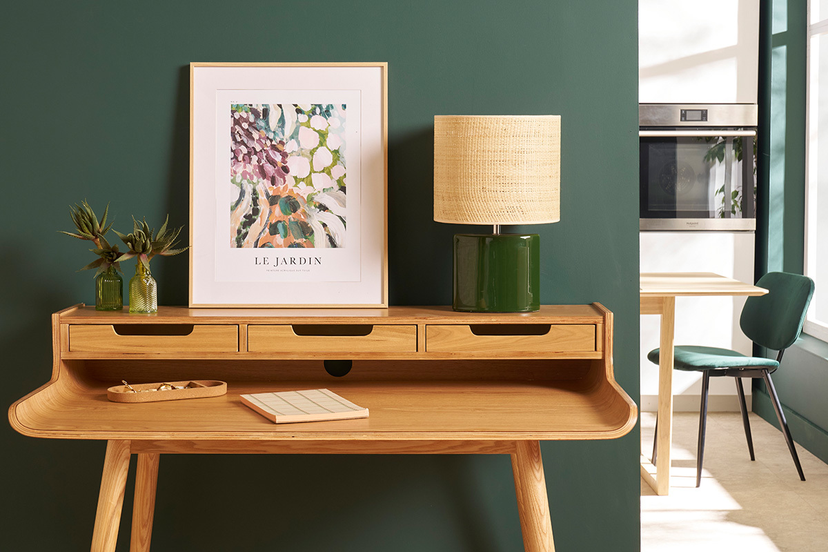Altrettanto funzionale quanto decorativa, questa piccola lampada da tavolo verde effetto laccato sarà perfetta per dare risalto a un mobile contenitore o a una consolle in un ingresso. Il suo paralume in rafia diffonderà una luce morbida e accogliente, ideale per creare un'atmosfera intima e rilassante.