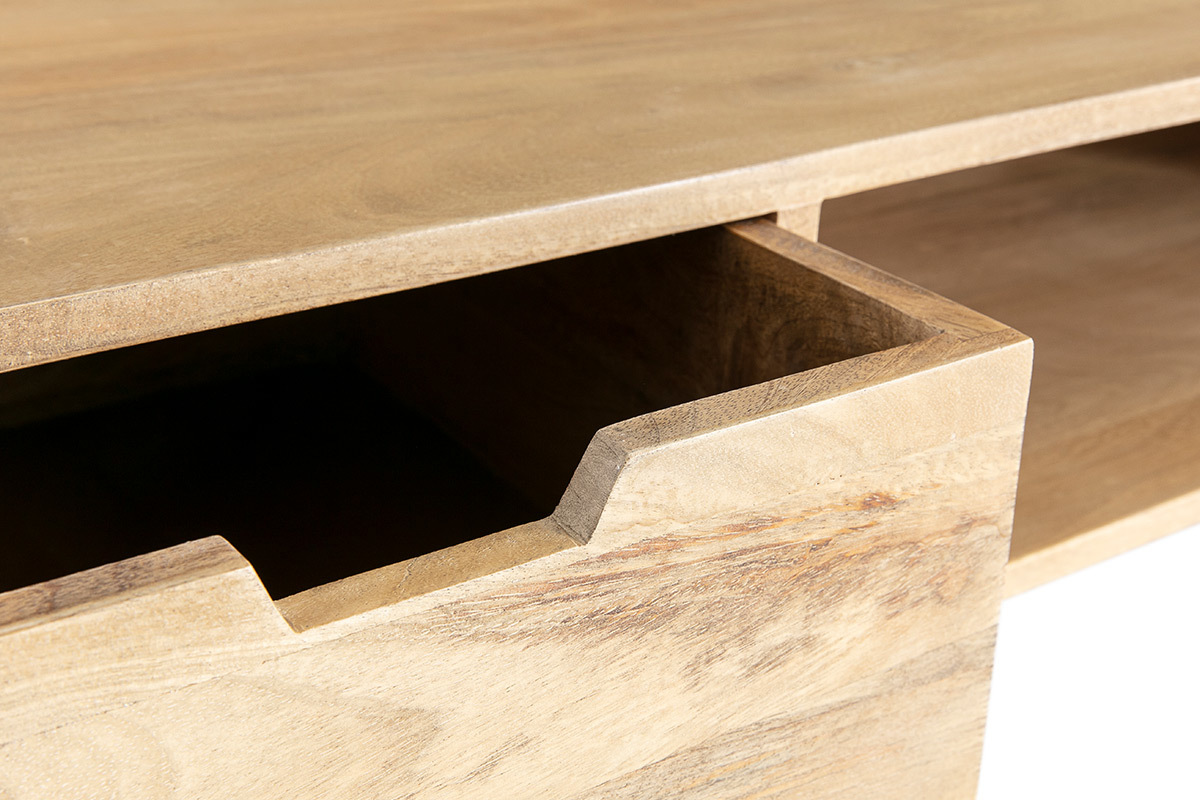 Realizzato a mano in legno di mango e metallo nero, questo mobile TV ha l'aspetto grezzo del "fatto a mano" e porterà una vera personalità nel tuo salotto. La particolare venatura dell'albero di mango offre dettagli e belle sfumature che lo rendono un pezzo unico di arredamento.
