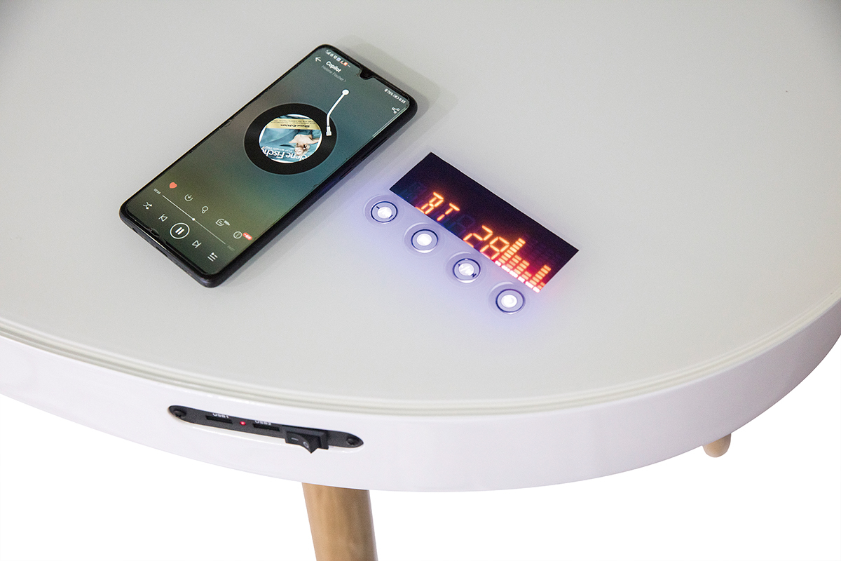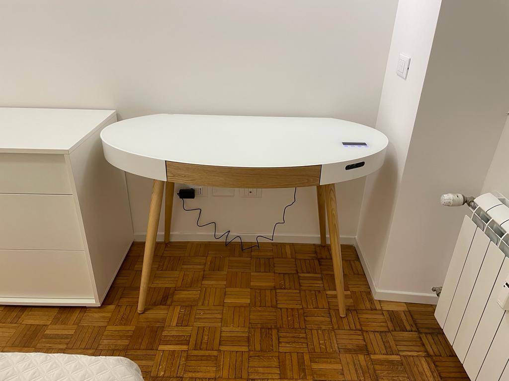 Questo ufficio bianco e legno chiaro dispone di due prese USB con le quali potrai ricaricare i tuoi dispositivi. Questo ufficio dotato di bluetooth consente di inviare audio da tablet, computer o smartphone. Gli altoparlanti integrati, con volume regolabile, diffondono un suono di grande chiarezza, superiore a quello offerto da un computer in termini di qualità audio. L'interfaccia touchscreen, posizionata direttamente sul piano dell'ufficio, ti permetterà di aumentare o diminuire il volume, passare alla canzone successiva o mettere in pausa la riproduzione di una traccia.
