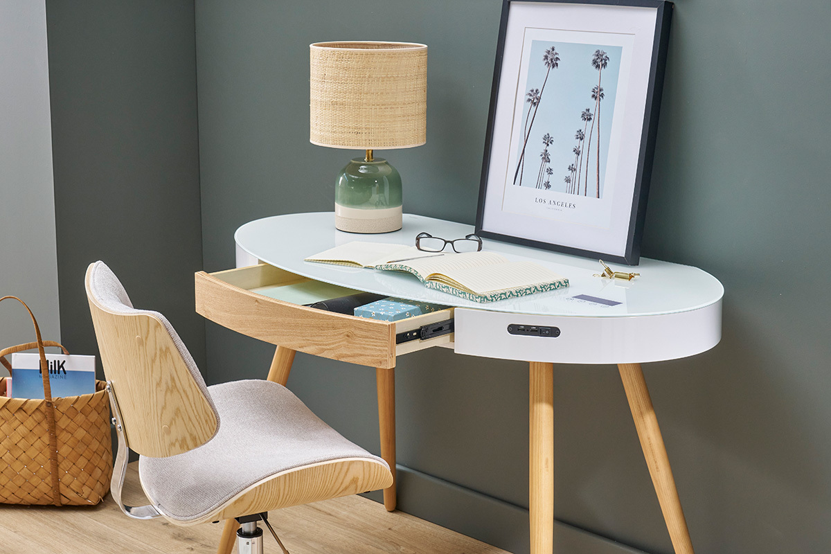 Per quanto riguarda l'estetica, questo ufficio connesso dal design bianco e legno chiaro non ha rivali! Per rendere HANDY un mobile pratico e decorativo, il ripiano in vetro temperato è abbinato a una struttura in pannelli di fibra di legno e a piedi in legno (faggio massiccio). Per completare il tutto, un ampio cassetto ti permetterà di riporre tutti i tuoi accessori da lavoro.