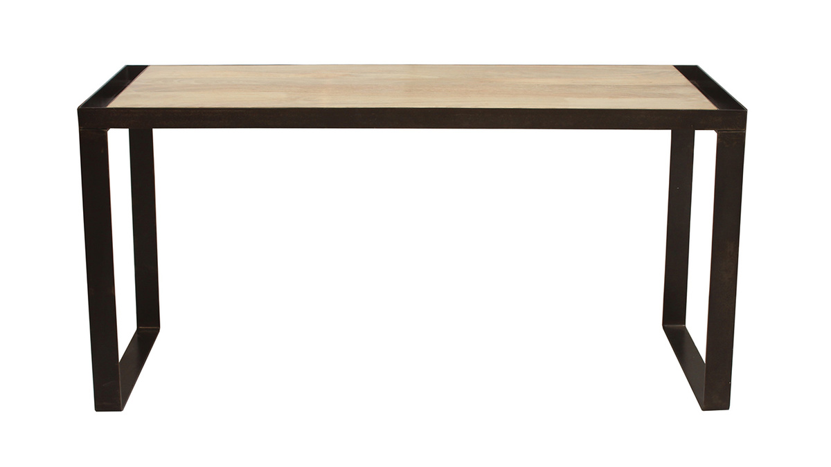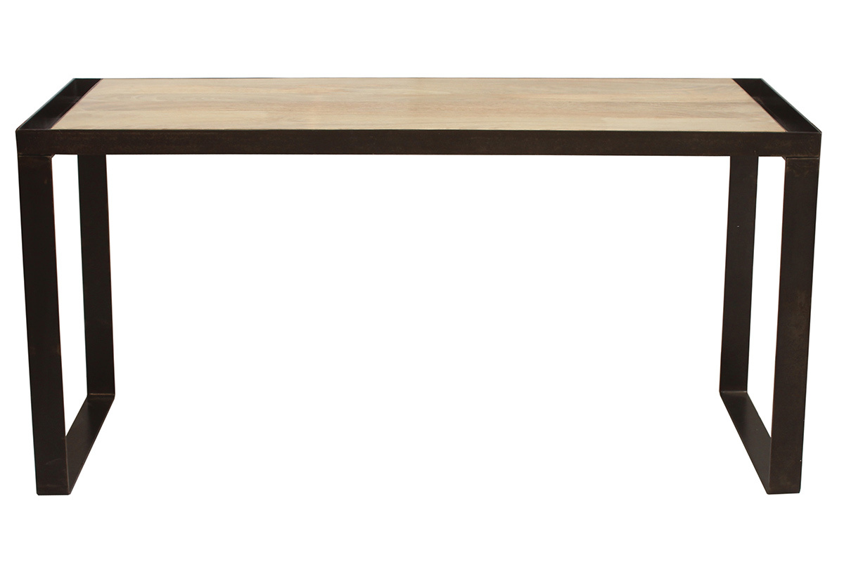 Struttura : acciaio grezzo, piano di lavoro in legno di mango, finitura vernice naturale incolore. Dimensioni totali L156xP60H75 cm, dimensioni del piano di lavoro L140xP60 cm, peso del collo 36 kg, dimensioni del collo L160xP74xH79 cm.
