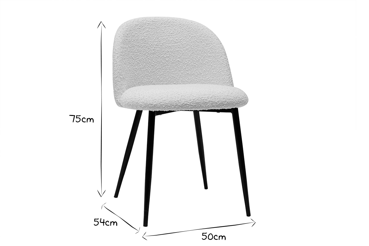 Tessuto effetto lana bouclé di colore écru, base in metallo nero, linee arrotondate: le sedie CELESTE sono comode ed accoglienti in linea con le tendenze attuali.
