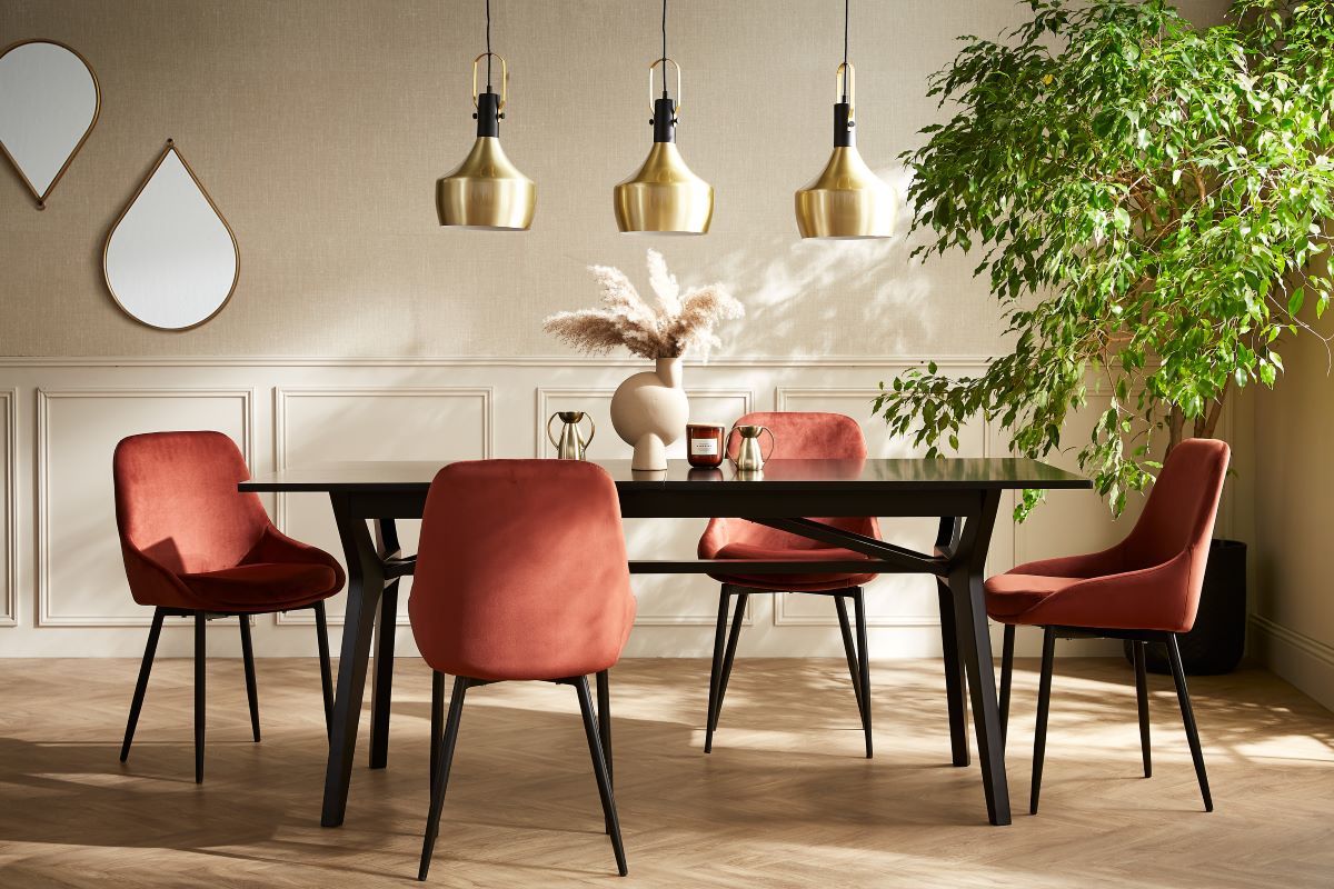 La combinazione tra la generosa seduta in velluto color mattonee la base fine in metallo nero conferisce a queste sedie uno stile delicato. Lo splendido rivestimento in velluto le rende ideali per una zona pranzo calda e accogliente. Il materiale scelto e la rotondità delle forme del modello HOLO ricordano le sedute vintage e conferiscono un tocco di morbidezza all'ambiente.