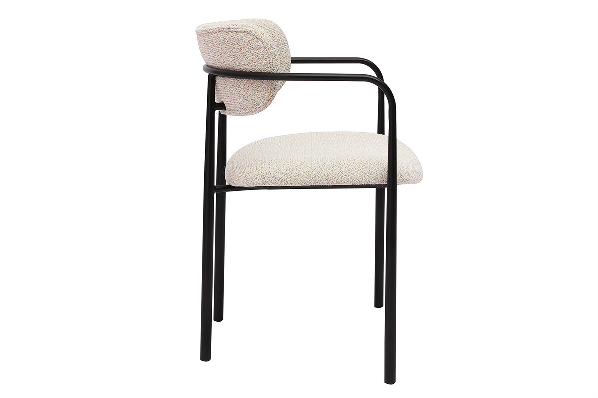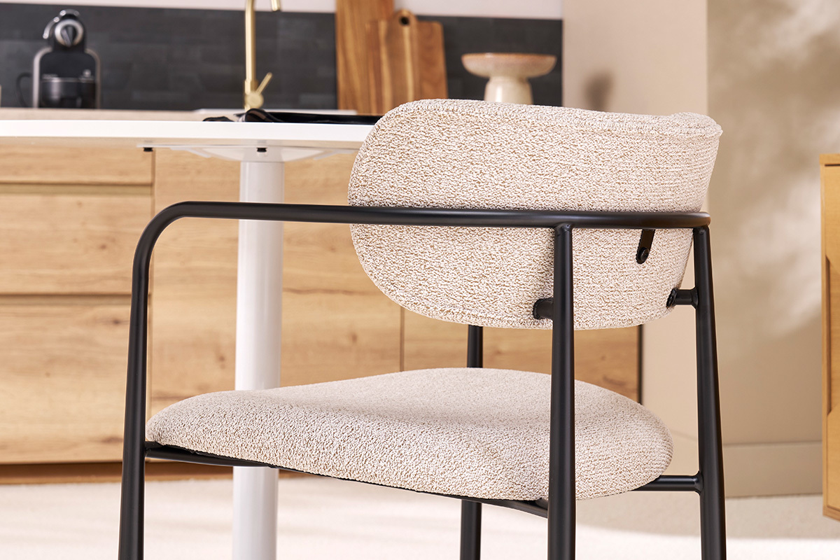 Queste sedute si distinguono per la loro silhouette pulita e le loro linee moderne. La struttura in metallo nero conferisce un tocco industriale, mentre seduta e schienale rivestiti di tessuto effetto velluto testurizzato aggiungono una sensazione di lusso e sofficità. Il colore beige, caldo e attuale, si integra armoniosamente in una vasta gamma di stili d'interni, dal contemporaneo al vintage, passando per il bohémien o lo scandinavo.