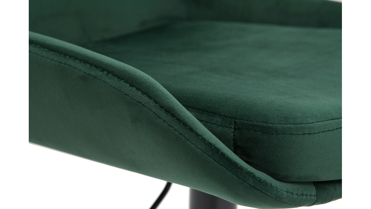 Gli sgabelli da bar HOLO non sono solo funzionali, ma anche comodi grazie alla seduta avvolgente. La seduta e lo schienale sono imbottiti (densità della schiuma 24 kg/m3) e interamente rivestiti di un bellissimo tessuto di velluto verde (100% poliestere), morbidissimo al tatto. Lo schienale alto (H38 cm) e il poggiapiedi integrato rendono la sensazione di comfort ancora più tangibile.