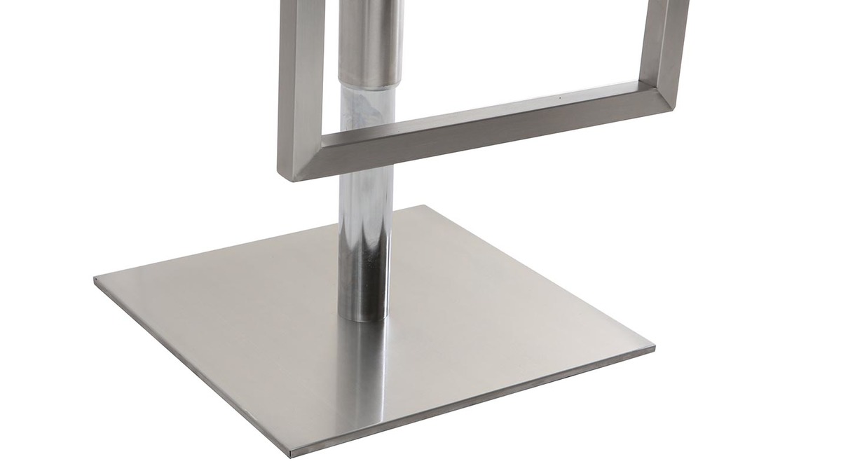 La base quadrata e il poggiapiedi rettangolare in metallo cromato danno allo sgabello un aspetto geometrico molto design.