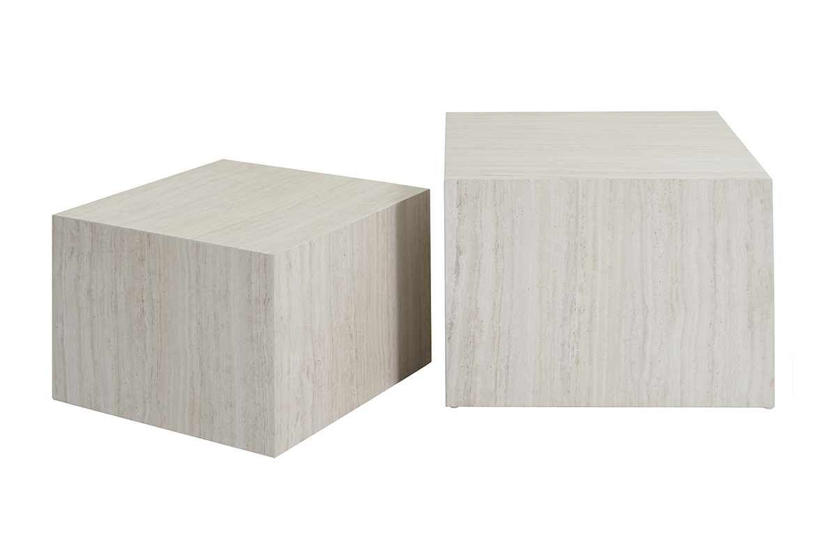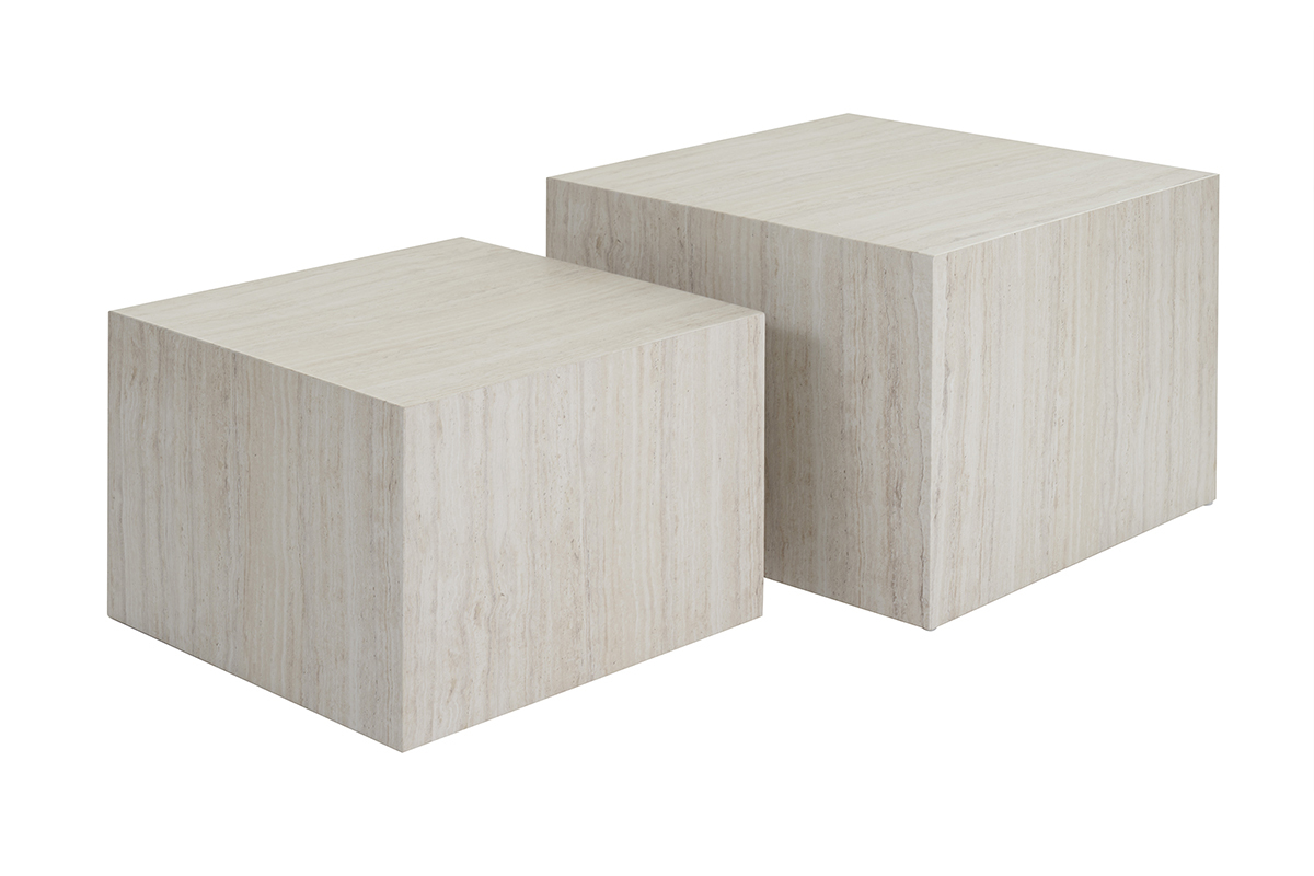 Il travertino torna in auge! I tavolini estraibili CALLA si ispirano a questa pietra, rinomata per il suo aspetto grezzo e la bella tonalità naturale, per formare un set di puro design.