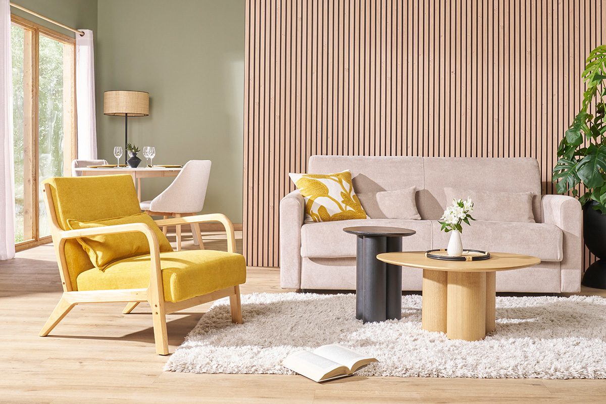 Con le sue linee fluide, funzionalità e robustezza vanno di pari passo! Elemento centrale di un salotto, costituito da una base a tre cilindri e da un ampio ripiano ovale (L79 x L61 x S1,8 cm) in pannelli in fibra di legno impiallacciato frassino, questotavolino da salotto in legno chiaro riunirà famiglia e amici per un aperitivo, un goloso spuntino o per una serata davanti al televisore per non perdere il programma preferito!